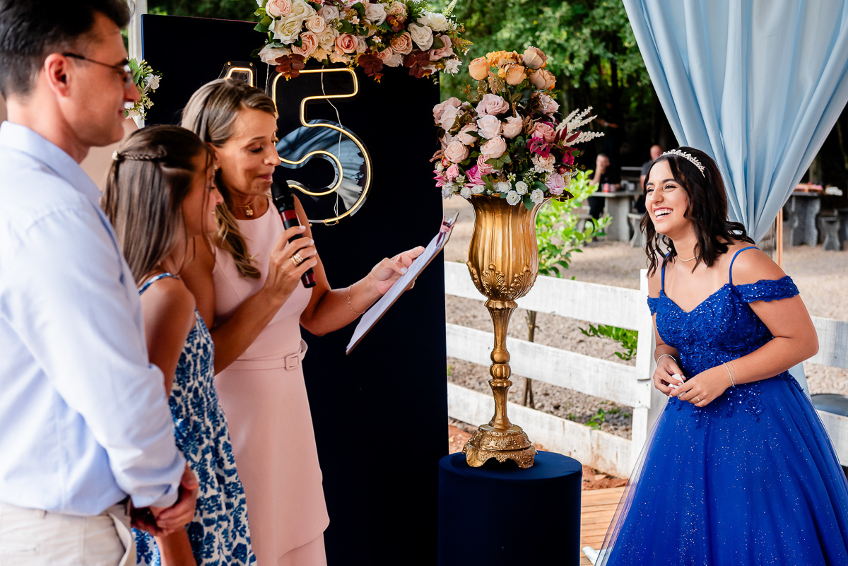 Doce no olhar, forte na personalidade, linda, de coração gigante e amante dos livros. Na sua simplicidade e no sorriso contagiante, ela conseguiu envolver todos ao redor e transformar seus 15 anos em um dia leve, verdadeiro e cheio de significado.