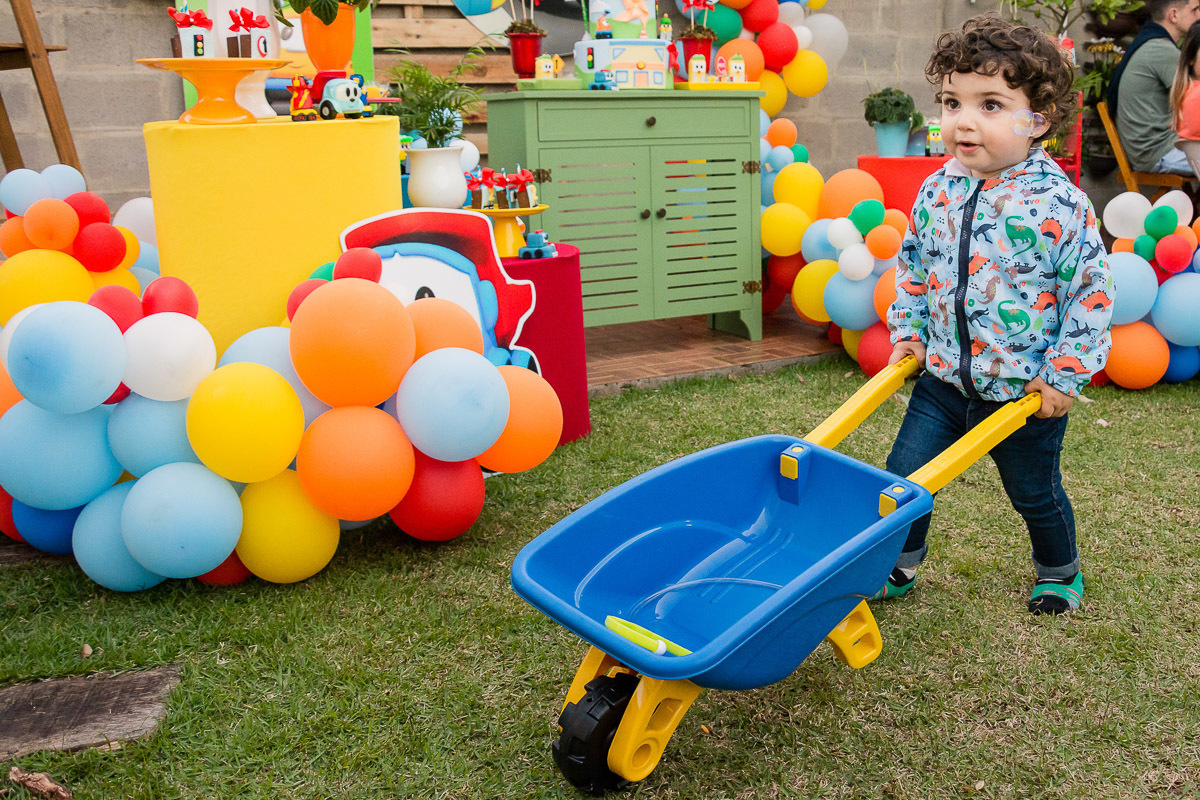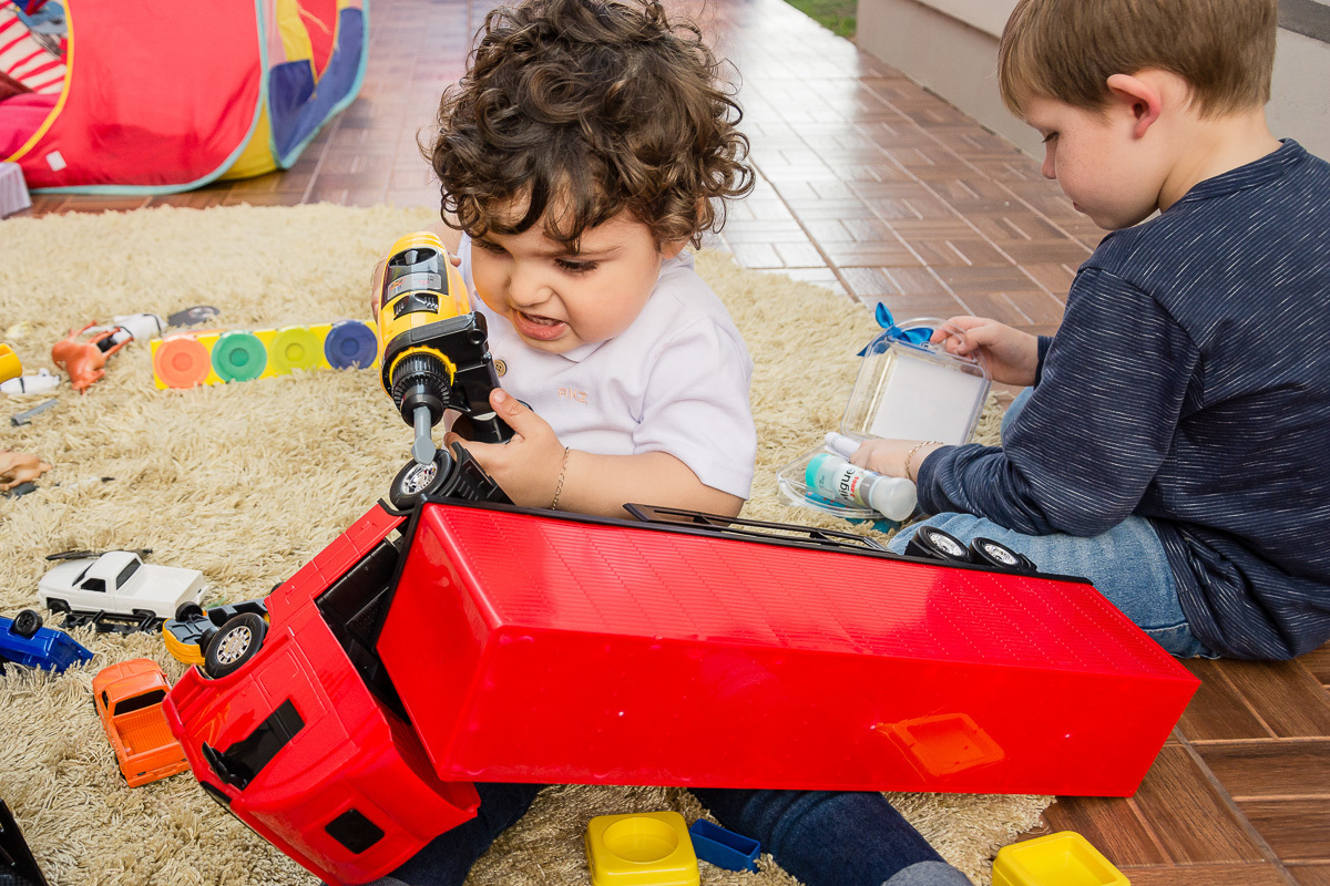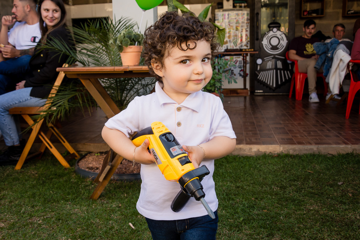 O Miguel comemorou o seu aniversário de 02 anos da melhor forma possível, com pessoas que o amam ao seu redor, muito espaço para correr e brincar na sua casa! Já estava todo feliz pois era o aniversário dele, assim que começaram a chegar os convidados com os presentes, os olhinhos do aniversariante brilhavam, aí chegou uma parafusadeira de brinquedo e o menino não quis mais saber de outra coisa, saiu por ai consertando tudo o que via pela frente!