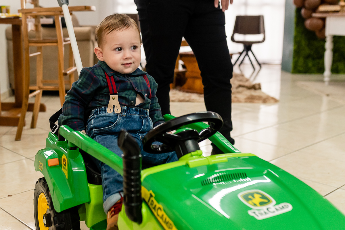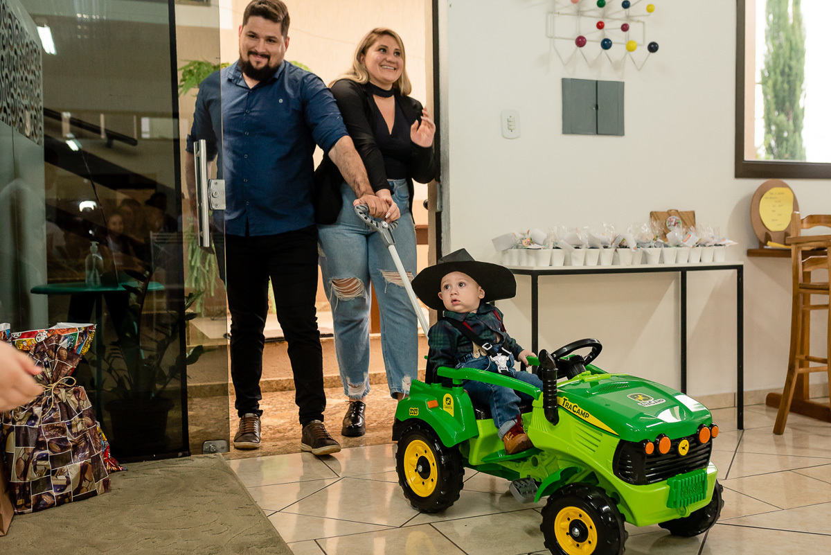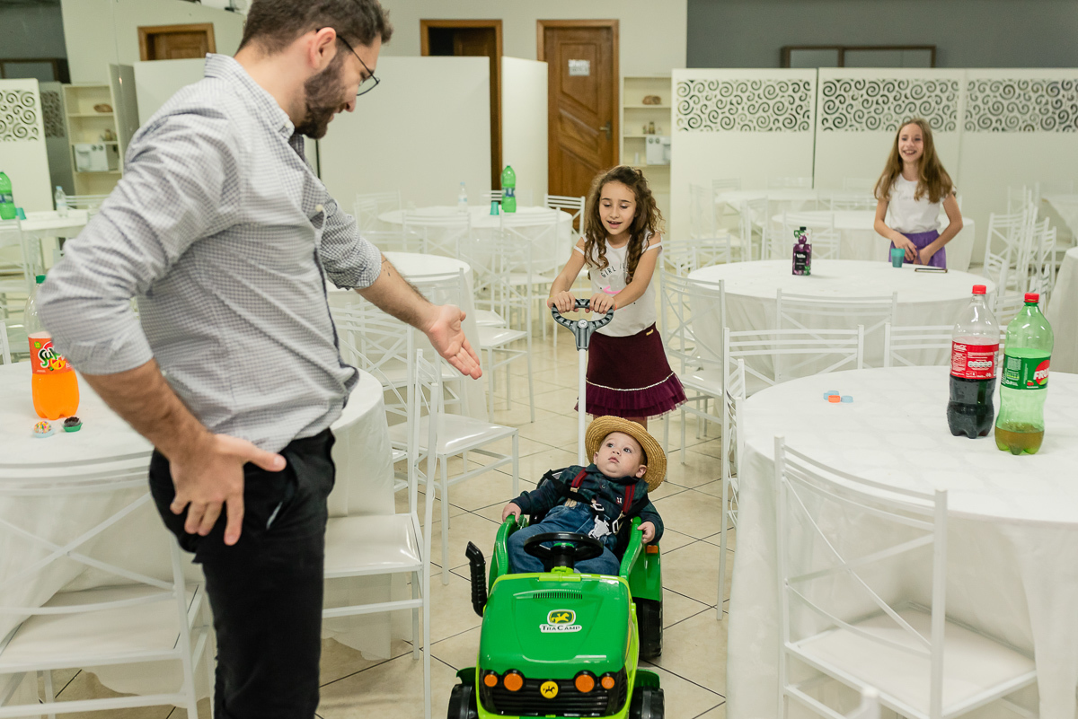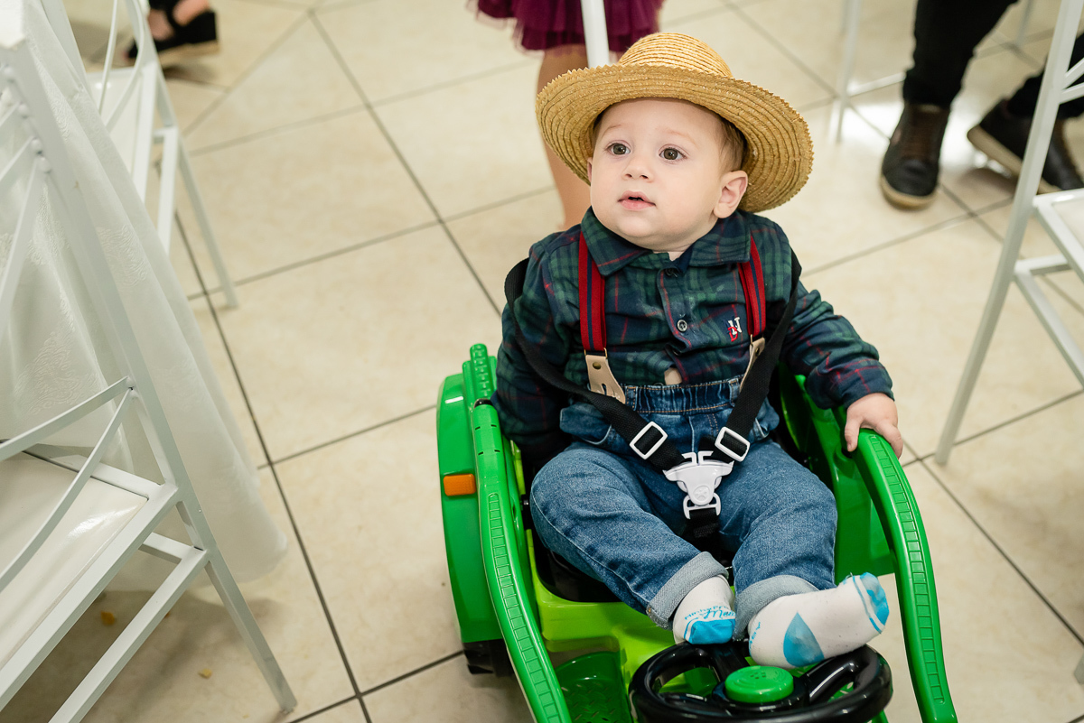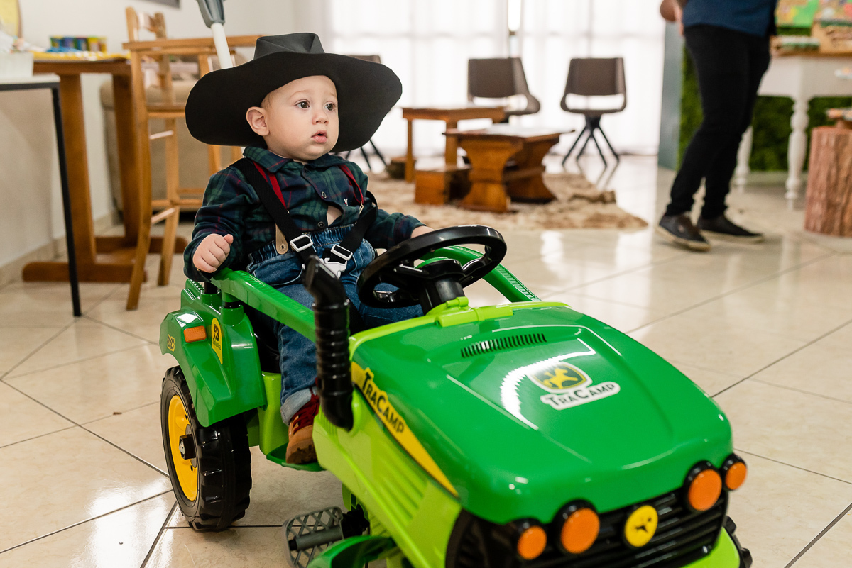 Chegou de chapéu e pilotando o seu trator para o delírio dos convidados. Deu uma bandinha e foi logo fazer as fotos e cumprimentar os convidados para depois explorar o local e brincar com os amigos, porque é o lugar que ele gosta de ficar, livre e solto para andar e conhecer o ambiente em que está. Mas como ninguém é de ferro, o Arthur estava tão confortável no colo do dindo que acabou pegando no sono e as primas continuaram a algazarra brincando com o bolo de aniversário!