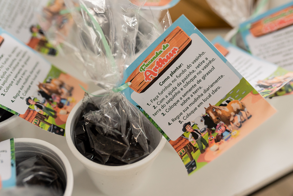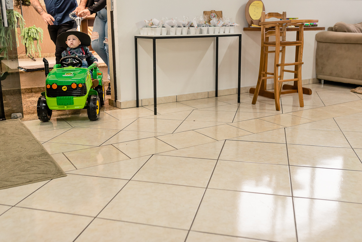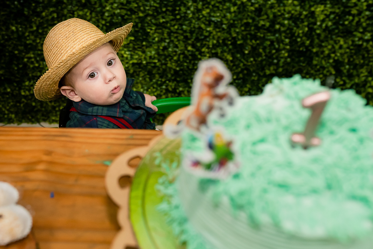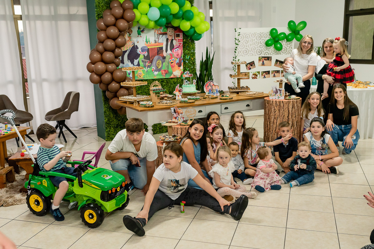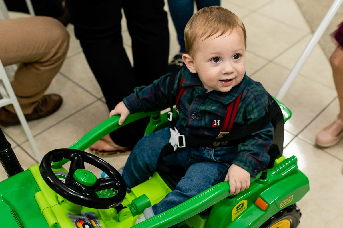 Chegou de chapéu e pilotando o seu trator para o delírio dos convidados. Deu uma bandinha e foi logo fazer as fotos e cumprimentar os convidados para depois explorar o local e brincar com os amigos, porque é o lugar que ele gosta de ficar, livre e solto para andar e conhecer o ambiente em que está. Mas como ninguém é de ferro, o Arthur estava tão confortável no colo do dindo que acabou pegando no sono e as primas continuaram a algazarra brincando com o bolo de aniversário!