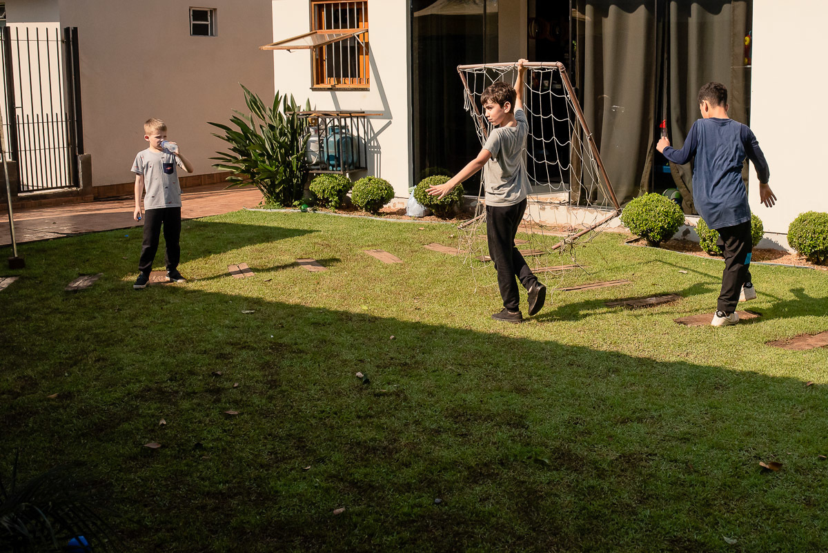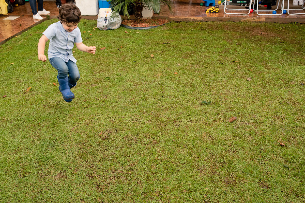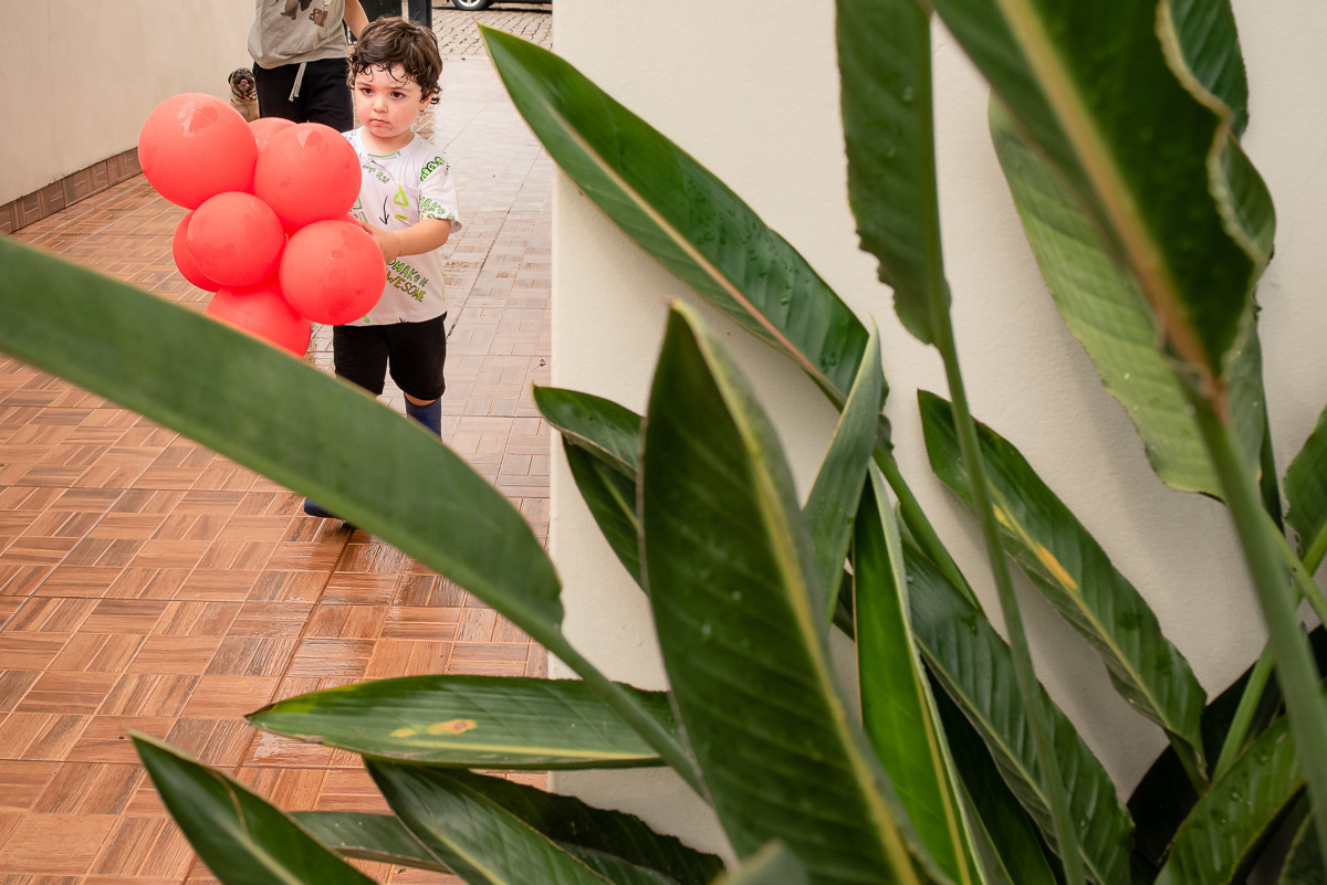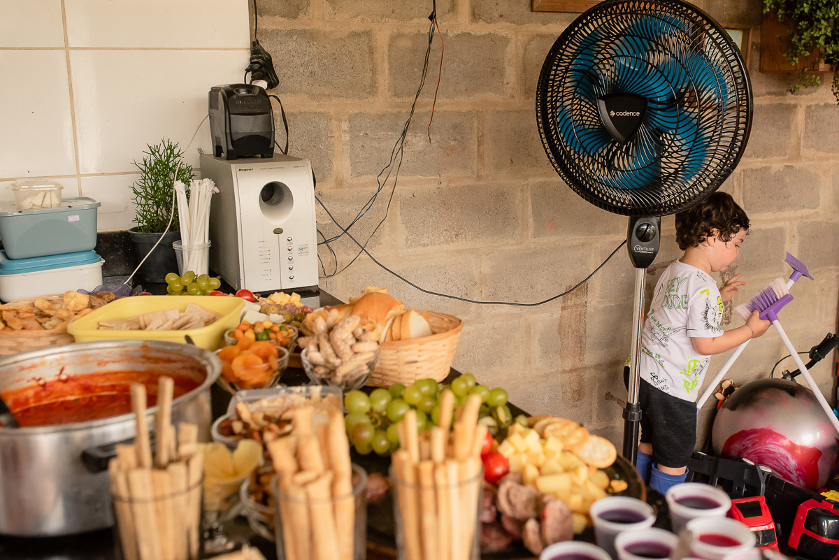 Como o aniversário tinha sido cancelado, voltamos para casa e quando o tempo tinha melhorado um pouco eu decidi mandar uma mensagem para a mãe do Miguel e pedi o que eles iriam fazer de noite. Ela já me mandou que estavam reorganizando a festa na casa deles, haviam ido buscar algumas coisas no sítio e me pediu se eu queria almoçar com eles e eu que não sou bobo, já fui direto e levei a câmera junto. Logo que cheguei encontrei um garoto todo animado em saber que a festa que ele tanto queria, iria acontecer!