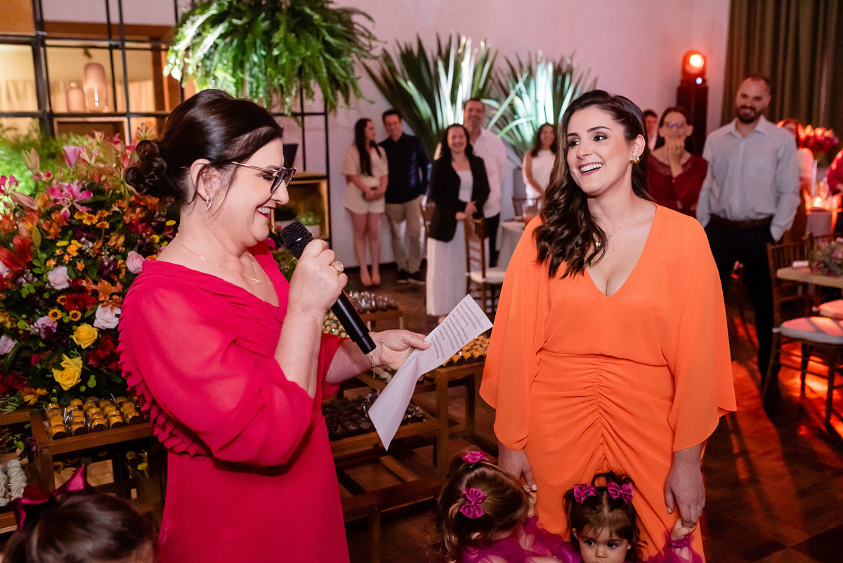 "Cada pessoa que está aqui essa noite conhece uma Mara! A Mara amiga. A Mara vizinha. A Mara patroa. A Mara funcionária. A Mara dos Biscoitos. A Mara empresária. A Mara irmã. A Mara sogra. Eu e a Amanda, conhecemos todas essas versões suas, mas conhecemos também a Mara mãe, que é dela que vamos falar.
