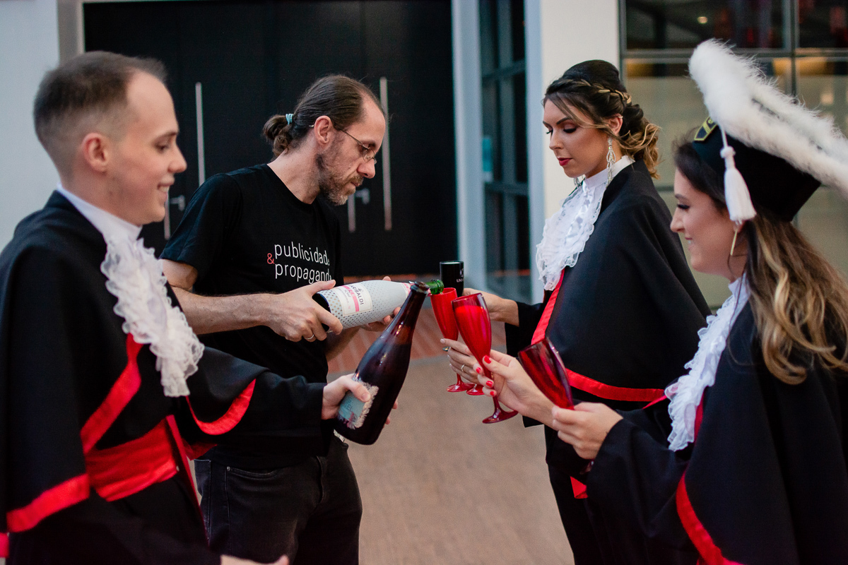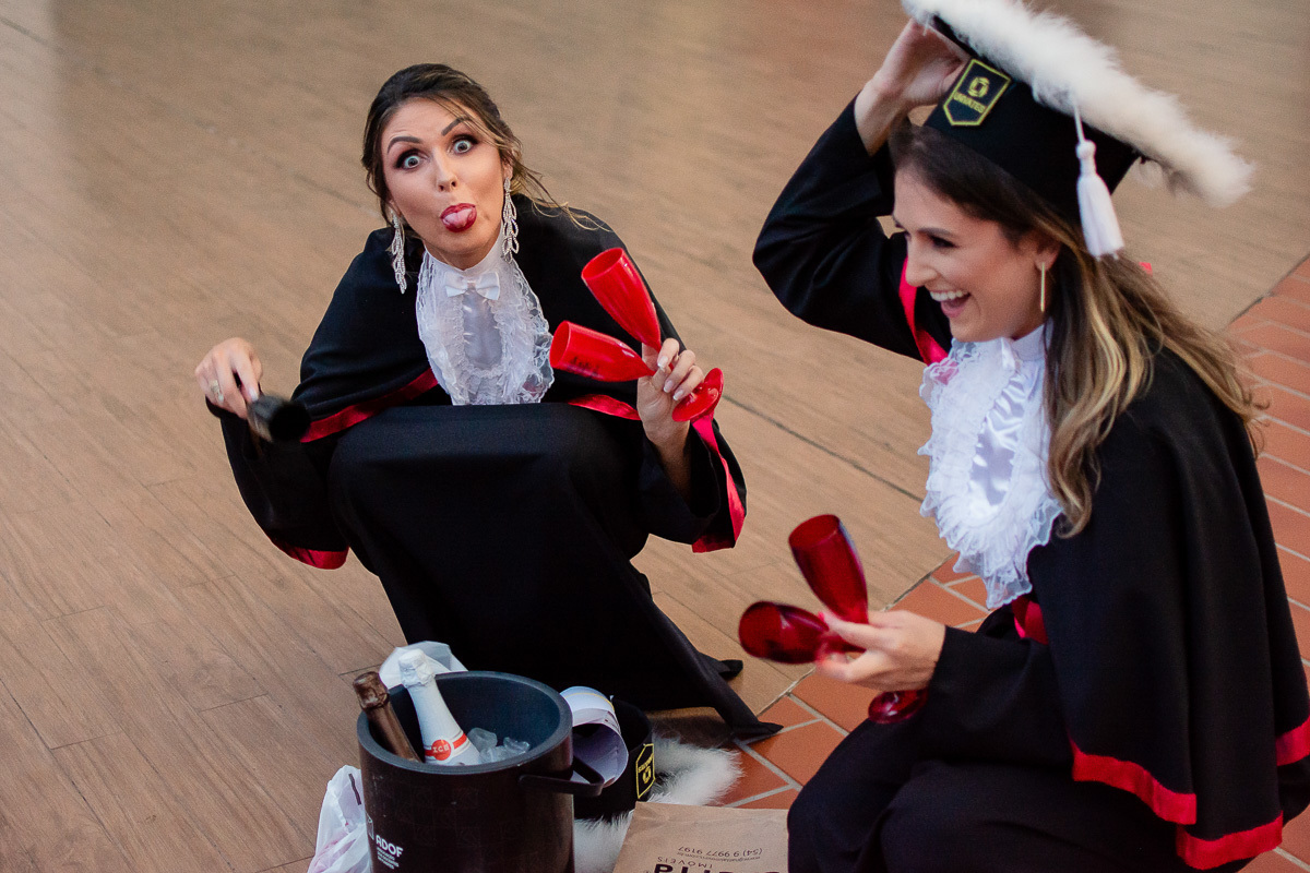 O dia tão aguardado chegou e começou logo cedo no salão das Divas (nome apropriado para essa mulher, não acham?!). Cabelo e maquiagem prontos, partiu Univates para fazer aquelas fotografias com a toga e comemorar com os colegas, até teve espumante! Diploma na mão e bora pra festa!