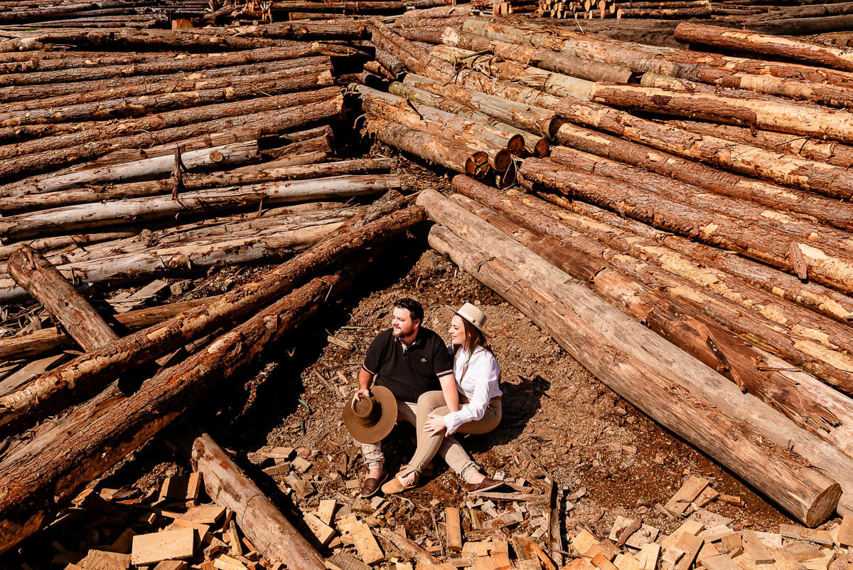 Depois seguimos para a empresa do Diego, uma serraria que representa trabalho, força e raízes. Em meio a caminhões, toras de madeira e serragem, o cenário bruto se encontrou com a sensibilidade dos dois, criando um contraste lindo e cheio de significado. Ali, entre marcas de história e cotidiano, finalizamos essa sessão com a mesma essência que eles carregam: autenticidade, verdade e muito amor.